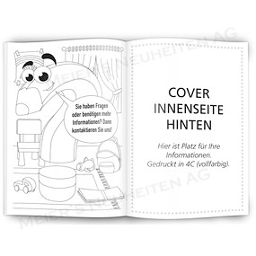 Sie suchen sich ein Standard-Malbuch aus 80 verschiedenen Themen aus, oder wir gestalten Ihnen Ihr individuelles Malbuch, dabei setzen wir wunschgemäss Ihre Motive und Ideen um! Werbemalbuch DIN A5 Format, zweifache Rückendrahtheftung 12 Seiten Inhalt mit 12 individuell gestalteten Motiven, 1C schwarz gedruckt auf wertigem 120 g/m² Offsetpapier weiss.4 Seiten Cover, vollfarbig 4C bedruckt, auf wertigem Bilderdruckpapier mit einer Stärke von 250 g/m². |