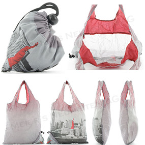 Die Falttasche ist in einem kleinen Beutel und findet in jeder Handtasche Platz! Das Zugband öffnen und die Tasche ist Einsatbereit.