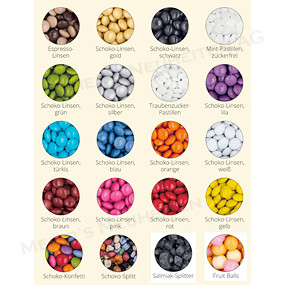 Das Kunststogff-Röhrchen kann mit folgenden sortenreinen Füllungen bestellt werden: Zuckerfreie Mintpastillen, Mini Espresso Schokolinsen (braun + beige gemischt) Traubenzuckerpastillen, Fruitballs, Salmiak-Splitter oder Mini-Schokolinsen bunt gemischt oder sortenrein. Die Schokolinsen gibt es in den Farben: blau, braun, gelb, grün, lila, orange, pink, rot, schwarz, türkis oder weiß. Es können auch 2-3 Wunschfarben (gemischt) in einem Reagenzglas bestellt werden. Mini-Schokolinsen in gold oder silber sowie vegane Mini Schokolinsen, bunt gemischt oder Schoko-Goldsterne (weiter Füllungen auf Anfrage). |