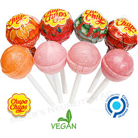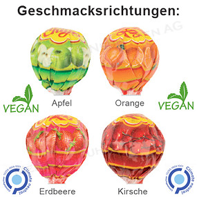 Bemerkungen: Der 12g Kugel-Lolly von Chupa Chups in den gemischten Geschmacksrichtungen Apfel, Orange, Erdbeere und Kirsche wird in der Box aus weissem Glanzkarton zum rundum sympathischen Werbeträger.