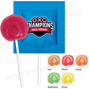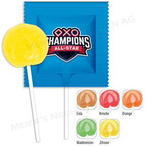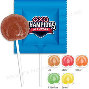 Lolli mit Cola-, Kirsche-, Orange-, Waldmeister- oder Zitronen-Geschmack