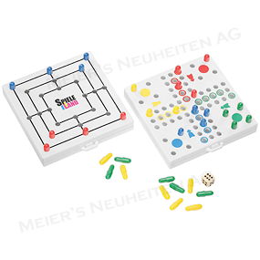Bemerkungen: Spiel zweiteilig mit Mensch ärgere dich nicht und Mühle im aufklappbaren Kunststoffgehäuse, dass gleichzeitig zur Aufbewahrung von Spielfiguren und Würfel dient.